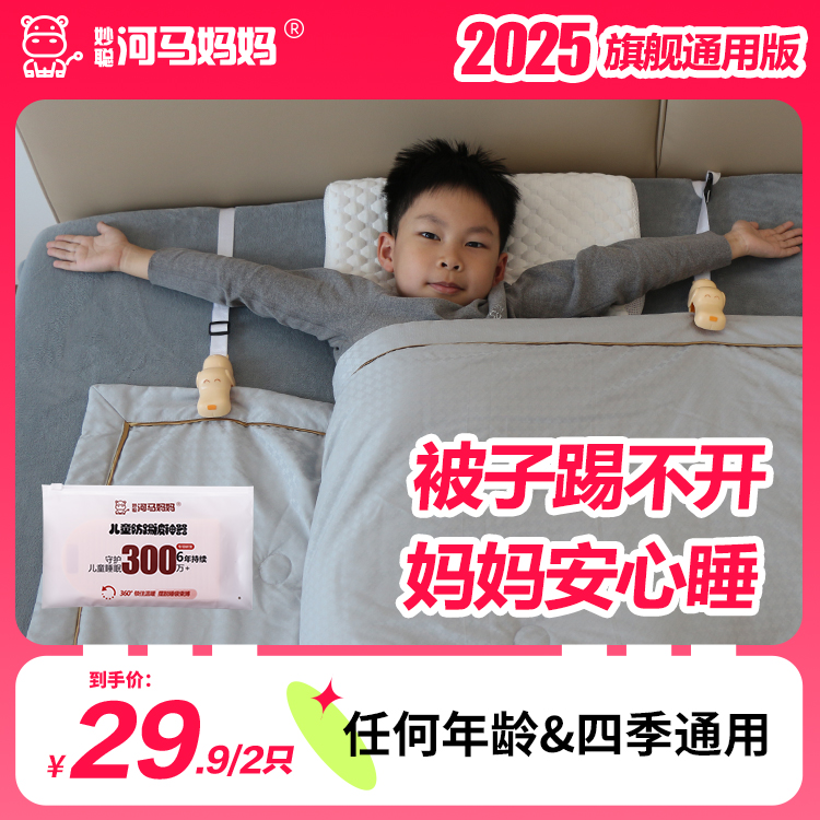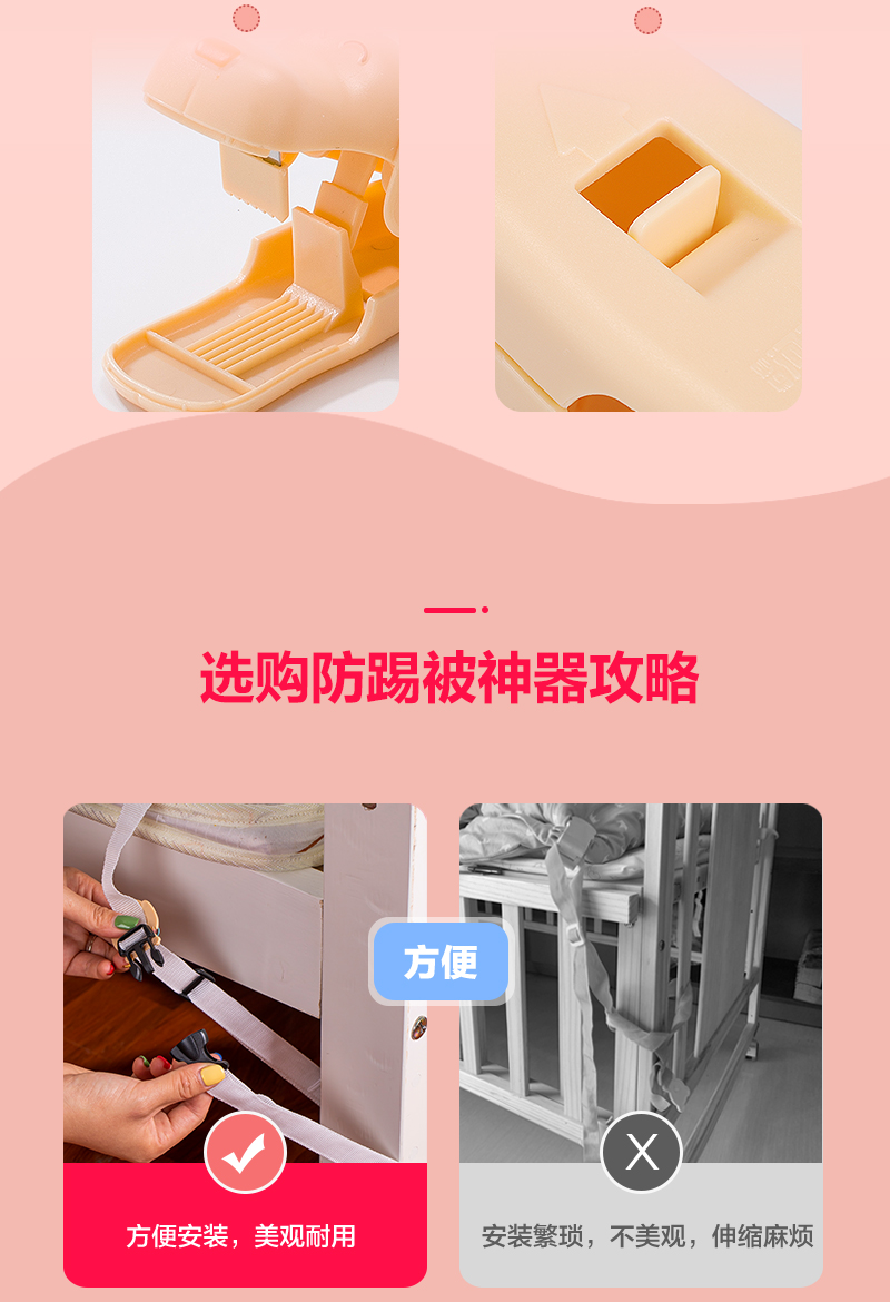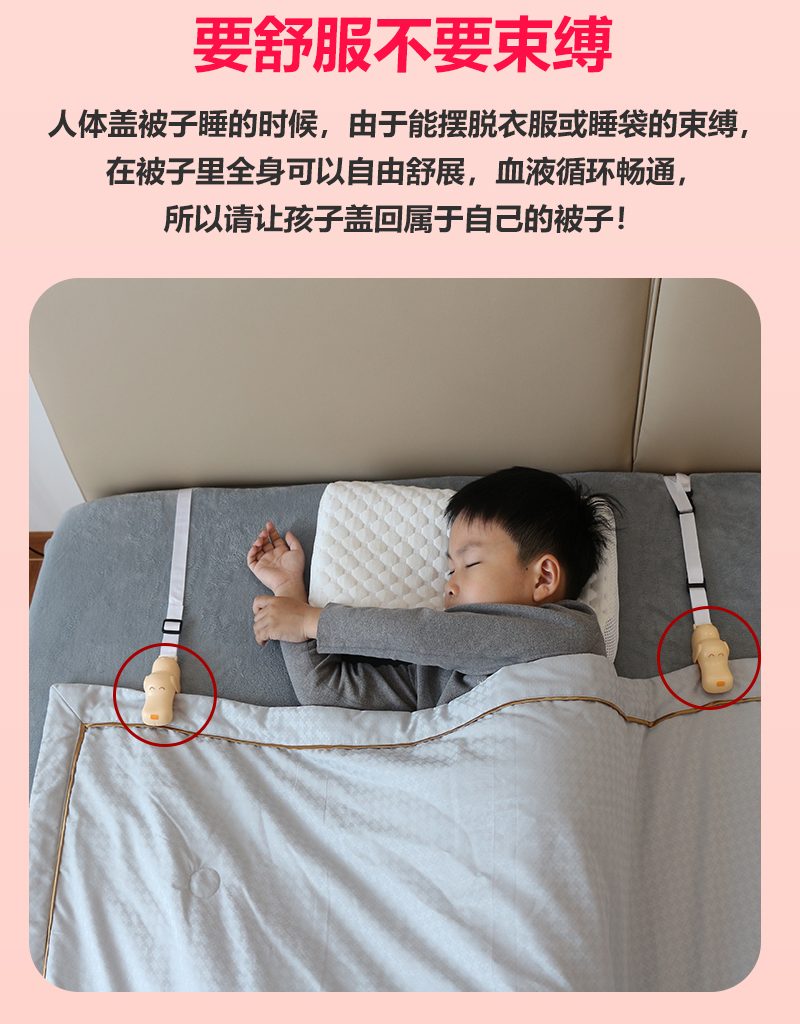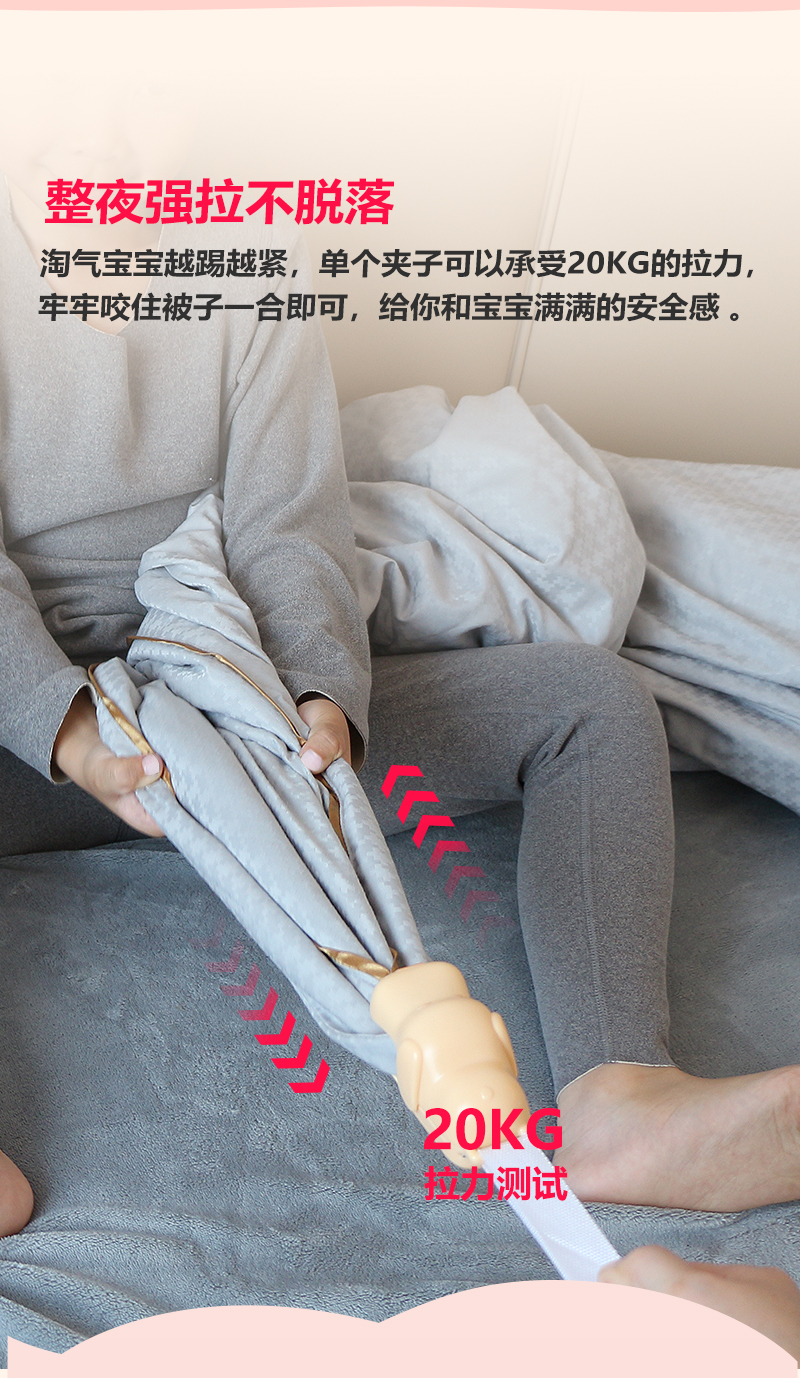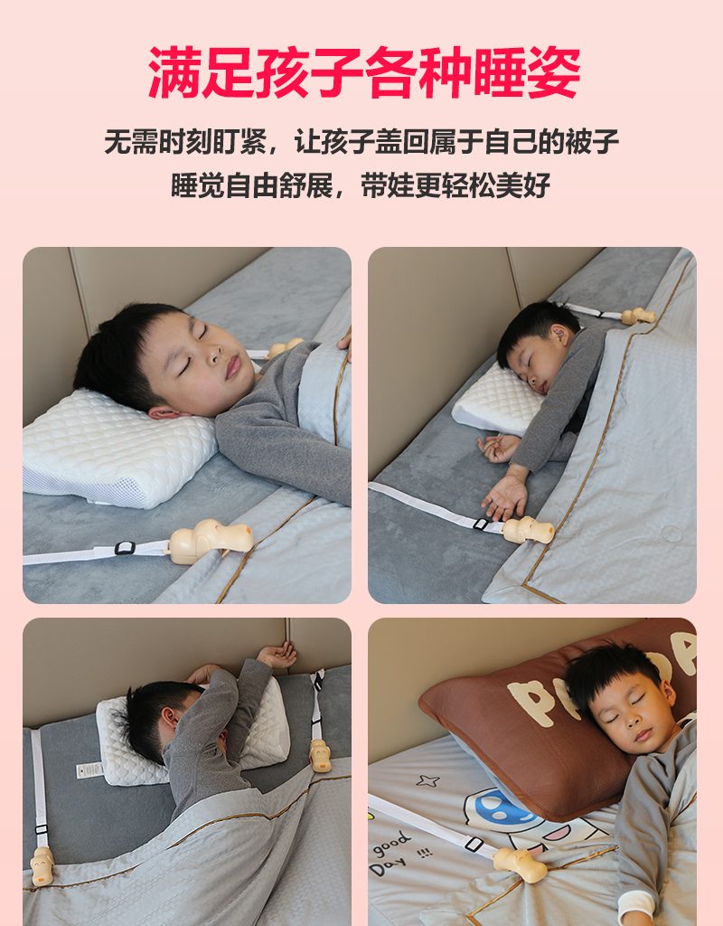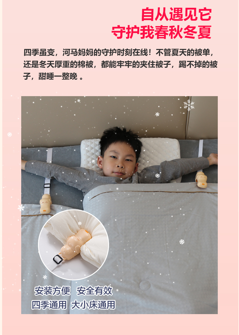 品牌:妙聪河马妈妈材质:pc(塑料之王)产地:广东省江门市适用季节:四季通用适用年龄:任何年龄通用安全类别:A类产品型号:2025PC升级旗舰版主要功能:利用绳子扣住床脚,或利用垫片卡住床板或床垫,另一头夹住被子,从而起到固定被子的作用,使儿童使用后,不能踢开被子。