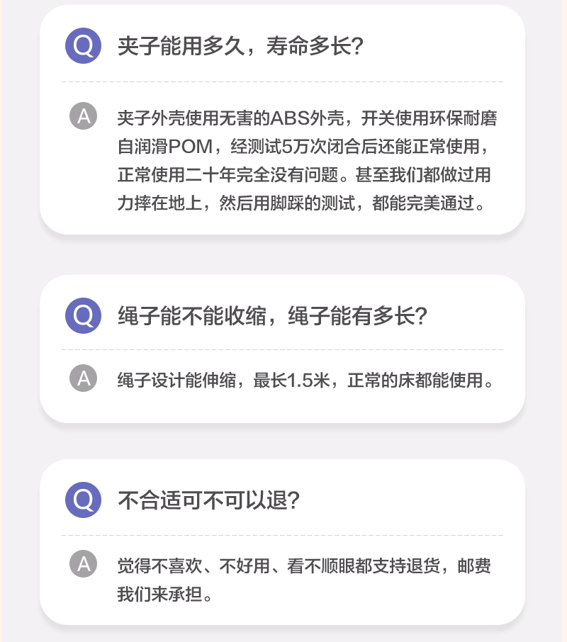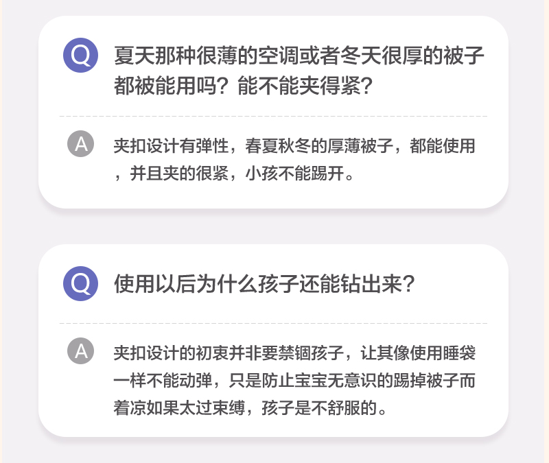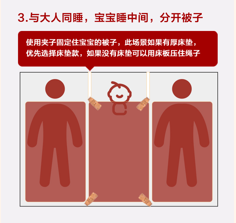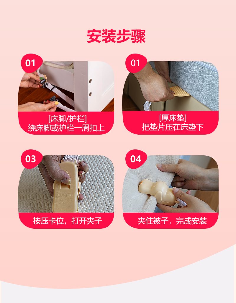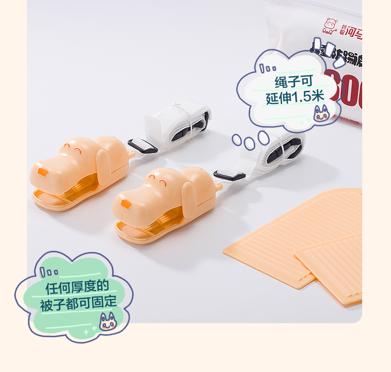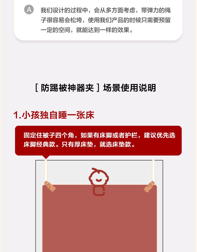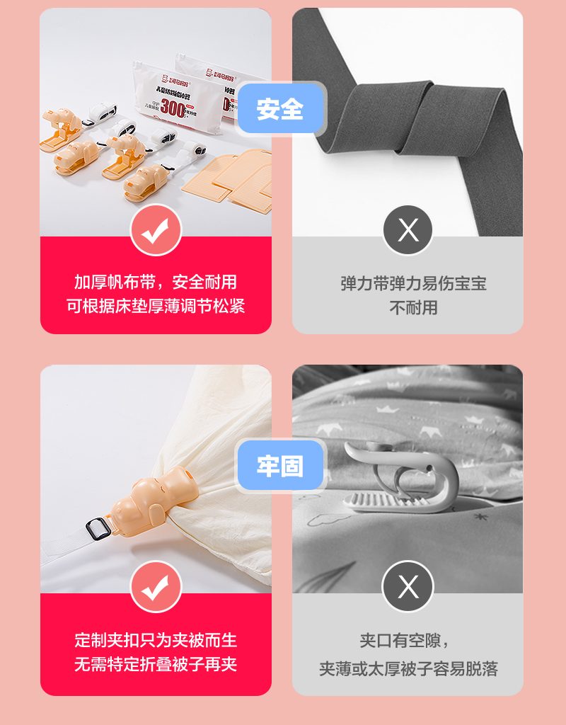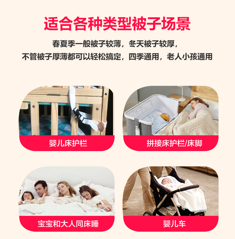 品牌:妙聪河马妈妈材质:pc(塑料之王)产地:广东省江门市适用季节:四季通用适用年龄:任何年龄通用安全类别:A类产品型号:2025PC升级旗舰版主要功能:利用绳子扣住床脚,或利用垫片卡住床板或床垫,另一头夹住被子,从而起到固定被子的作用,使儿童使用后,不能踢开被子。