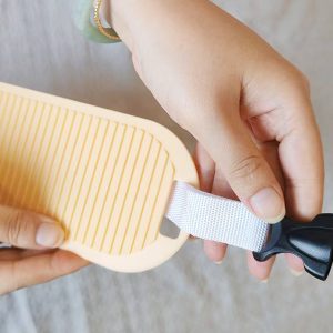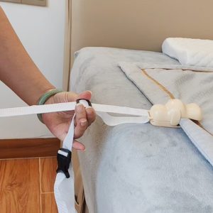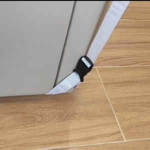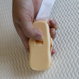 如果没有床脚有床垫,就要使用垫片:先打开绳子卡扣穿过垫片的小孔,然后抬起床垫,压住垫片(如果使用床脚请忽略此步骤)